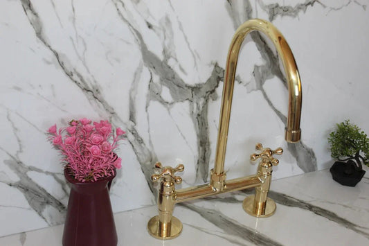 Unlacquered Brass Bridge Faucet with Sprayer and Cold Faucet, Kitchen Spout, Brass Kitchen Faucet, Sink Faucet, Curved Bridge Faucet Brass