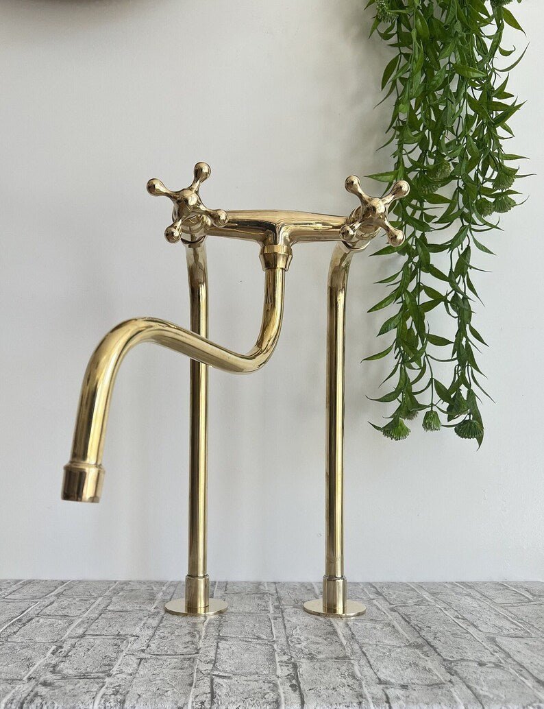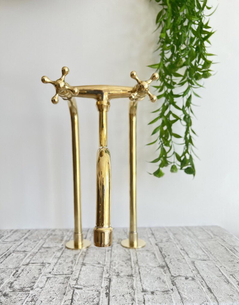 Küchenarmatur aus unlackiertem Messing, handgefertigte Brückenarmatur mit geraden Beinen und verschiedenen Griffvarianten – Küchenarmaturen