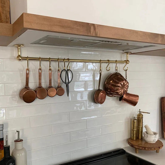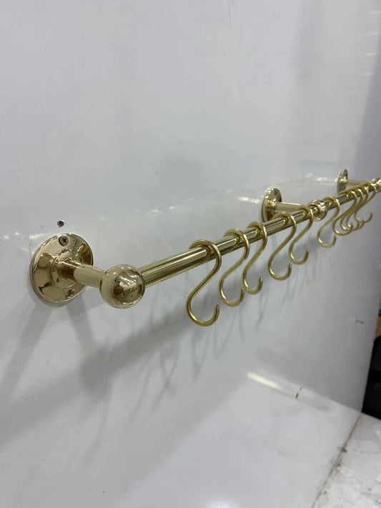 Unlacquered Brass Pot Rail with "S' hooks, Antique Style Unlacquered Brass Pot Rack Vintage Handmade Gold Brass Pot Rack Rustic Wall Mounted