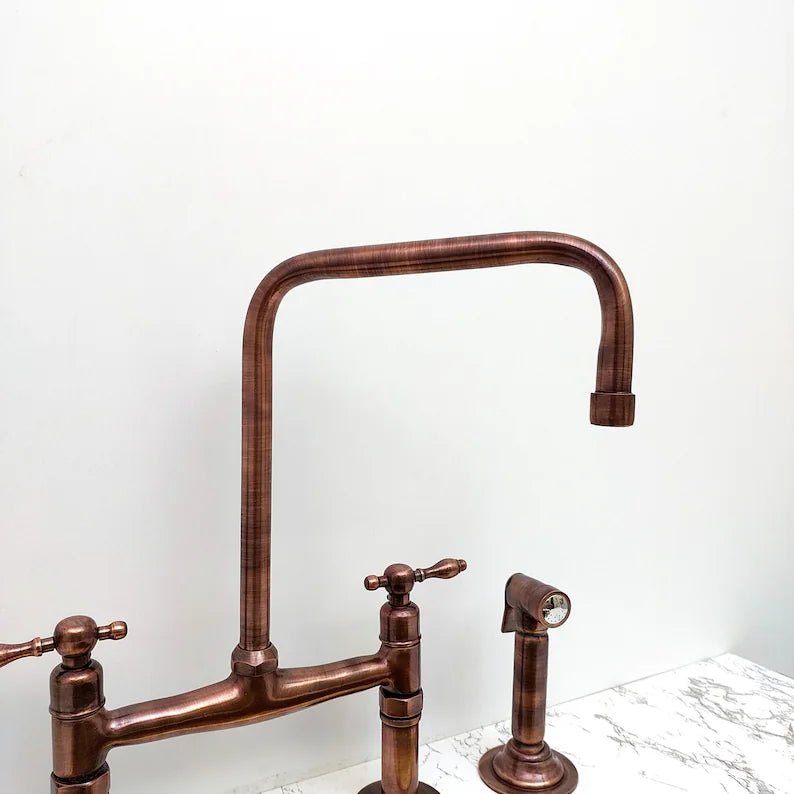 Robinet de cuisine en cuivre massif avec double poignée et douchette.