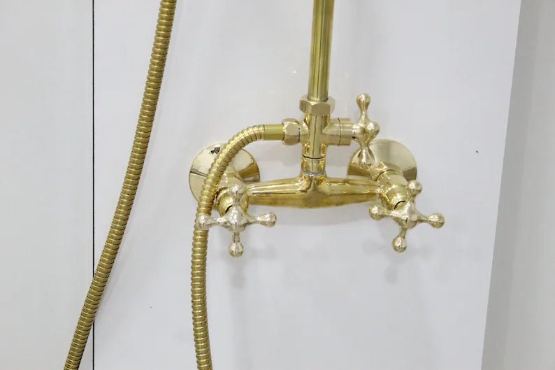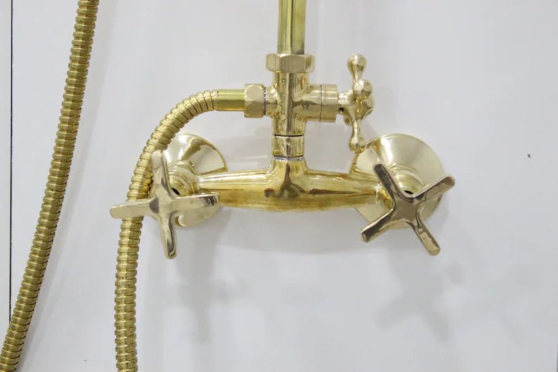 Unlacquered Brass Shower System with Handheld And Vintage Head Combo, Exposed Pipe, hight pressure brass hose